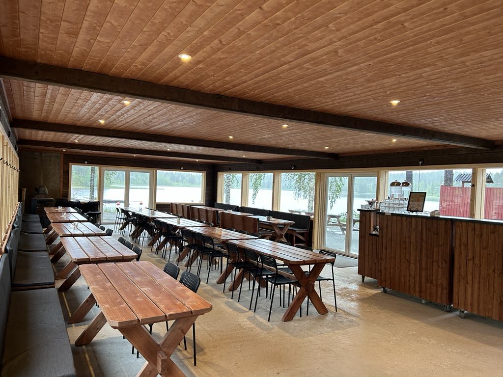 Nu är Strandbaren klar – en jättetrevlig lokal som rymmer uppemot ca 90 personer. Med en fantastisk utsikt över den västra delen av Norsjön. Våra härliga fönster gör att man får känslan av att sitta utomhus fastän man sitter inne i lokalen.